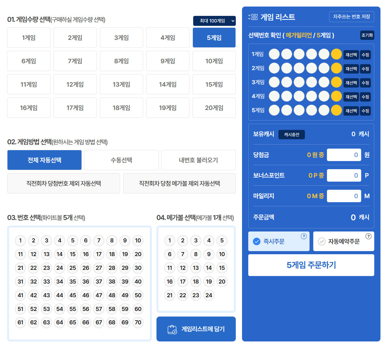 총 6개의 번호를 선택 (화이트볼 5개 + 메가볼 1개)- 1.